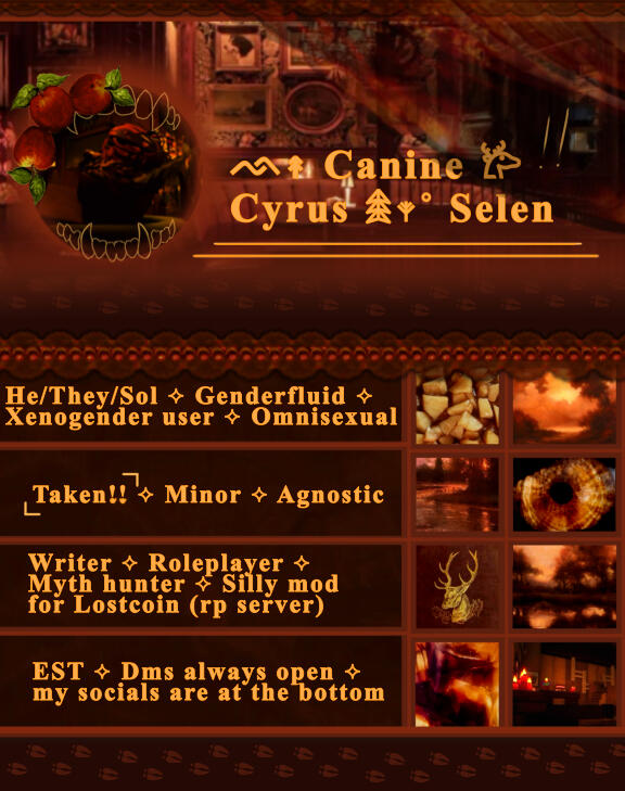 * ˚ . . ˚ . . ˚ . . ✦I write and roleplay often (mostly minecraft) and I have written two fantasy worlds of my own (going on 3), one I made with my lover :) All of my characters are personally fleshed out with deep lores and lots of thought put into them!! The characters I use most often areGrimrose - A haunted, ritualist deer-man :) I use him most during myth hunts but most commonly in Lostcoin (Spoiled ass OC btw he has like everything ever and this CARRD is also themed on him)Aureliano - An angel born to just be a king, he shows it in his actions too! I use him often in lostcoin as the king of SuncrestStellan - (Lostcoin AU at least): A teenage boy who’s determined to rebel against the government along with his bestfriend, they often hunt together as species huntersWinslie - A wolf girl who fucks around and finds out, I use her a lot in Lostcoin for lighthearted, fun loreSomerset - A stereotypical surfer boy(..girl) with a tropical and fun theme! Definitely one of my most friendly charactersChantelle - A sweet, sleepy unicorn lady who will roam your dreams like she belongs there! She is definitely my most chilled and friendly OC˚✦ . . ˚ . . ˚